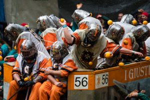 Un carnevale senza maschere…un carnevale storico che sebbene abbia origini e radici più antiche, è consuetudine datarne l’origine nel 1808; anno in cui inizia la verbalizzazione scritta delle cerimonie nei Libri dei Verbali. Stiamo scrivendo del Carnevale di Ivrea. Un evento unico in cui storia e leggenda si intrecciano per dar vita a una grande festa civica popolare dal forte valore simbolico e con numeri importanti. Sono, infatti, circa 100.000 gli spettatori che attira ogni anno. 11.000 i quintali di arance utilizzate durante la Battaglia nel 201, nove le squadre a piedi e oltre cinquanta i carri divisi tra pariglie e tiri a quattro che prendono parte alla Battaglia in ogni edizione.