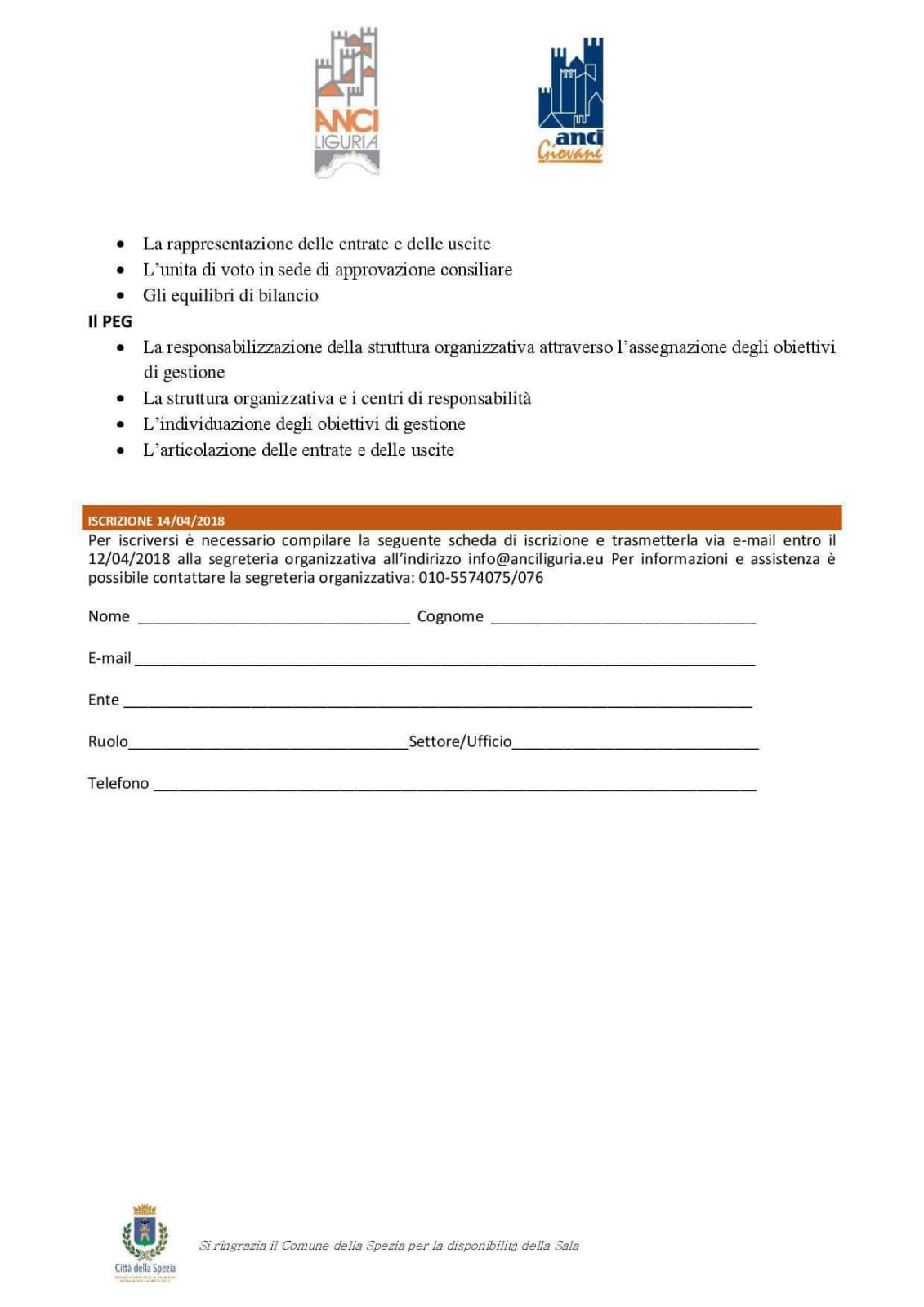 Sabato 14 Aprile alle ore 9.30 presso la biblioteca "Beghi" della Spezia si terrà l’evento "Gli strumenti della programmazione amministrativa – Peg, dup e bilancio di previsione", organizzato dal coordinamento Anci giovani Liguria, con il supporto attivo di Anci Liguria e la collaborazione del Comune della Spezia. (programma); (scheda di iscrizione).