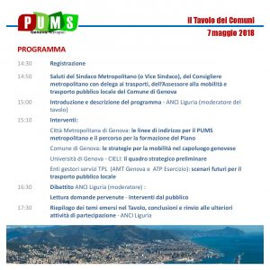 Al tavolo dei Comuni interverranno il vicesindaco metropolitano Carlo Bagnasco, il consigliere metropolitano con delega ai Trasporti Claudio Garbarino, Enrico Musso dell’Università di Genova e rappresentanti delle aziende di trasporto pubblico locale AMT Genova e ATP Esercizio. Il direttore generale ANCI Liguria Pierluigi Vinai modererà il confronto con i Sindaci del territorio metropolitano.